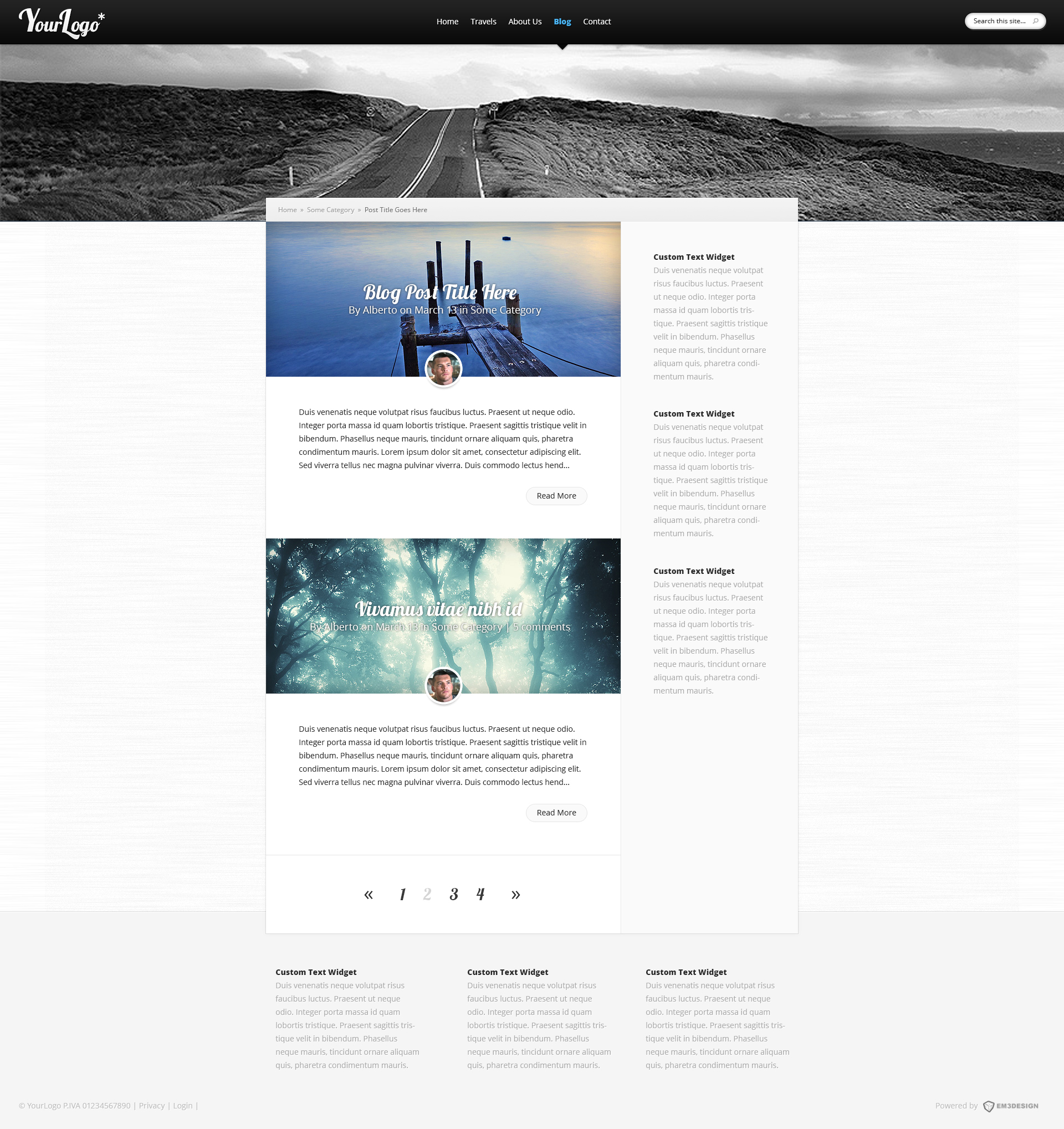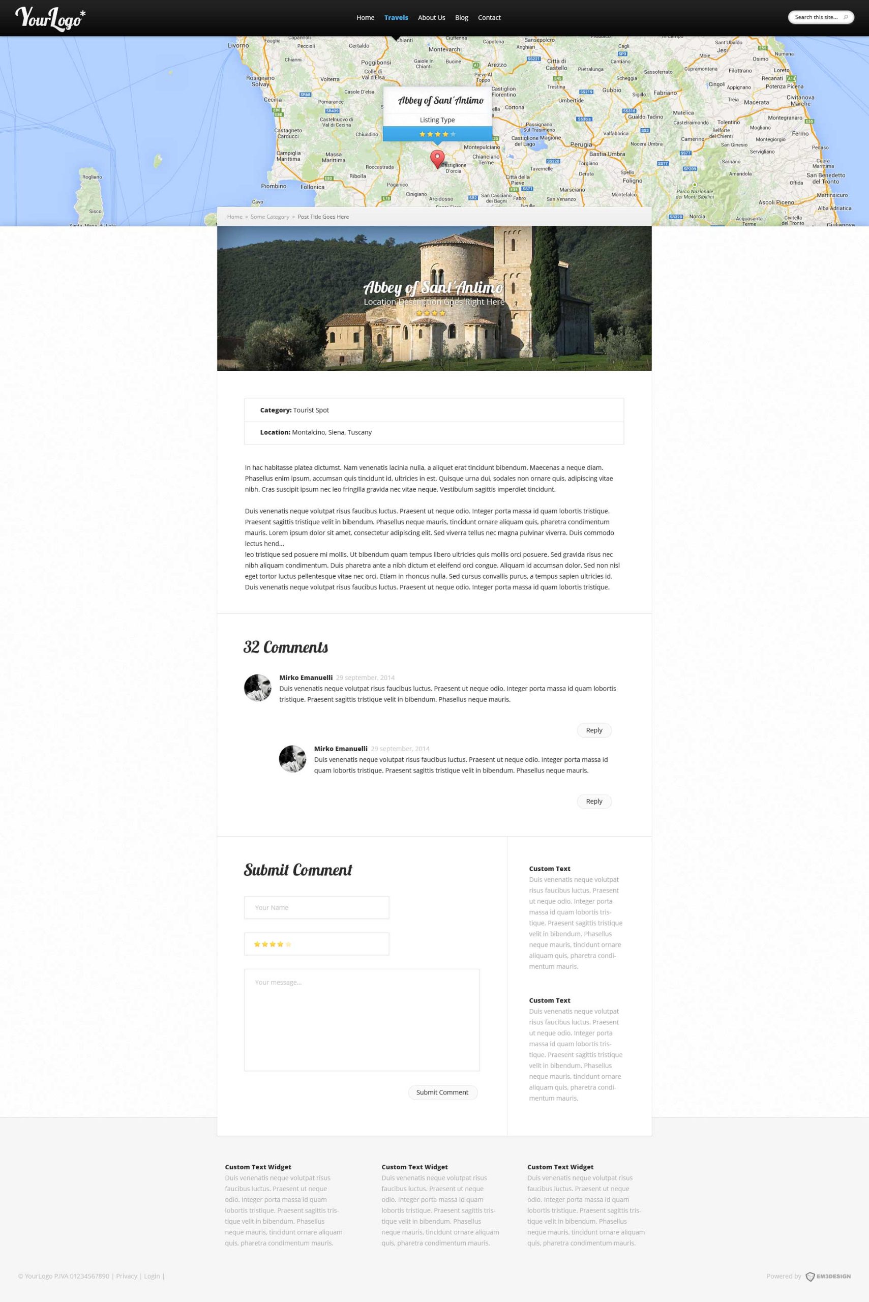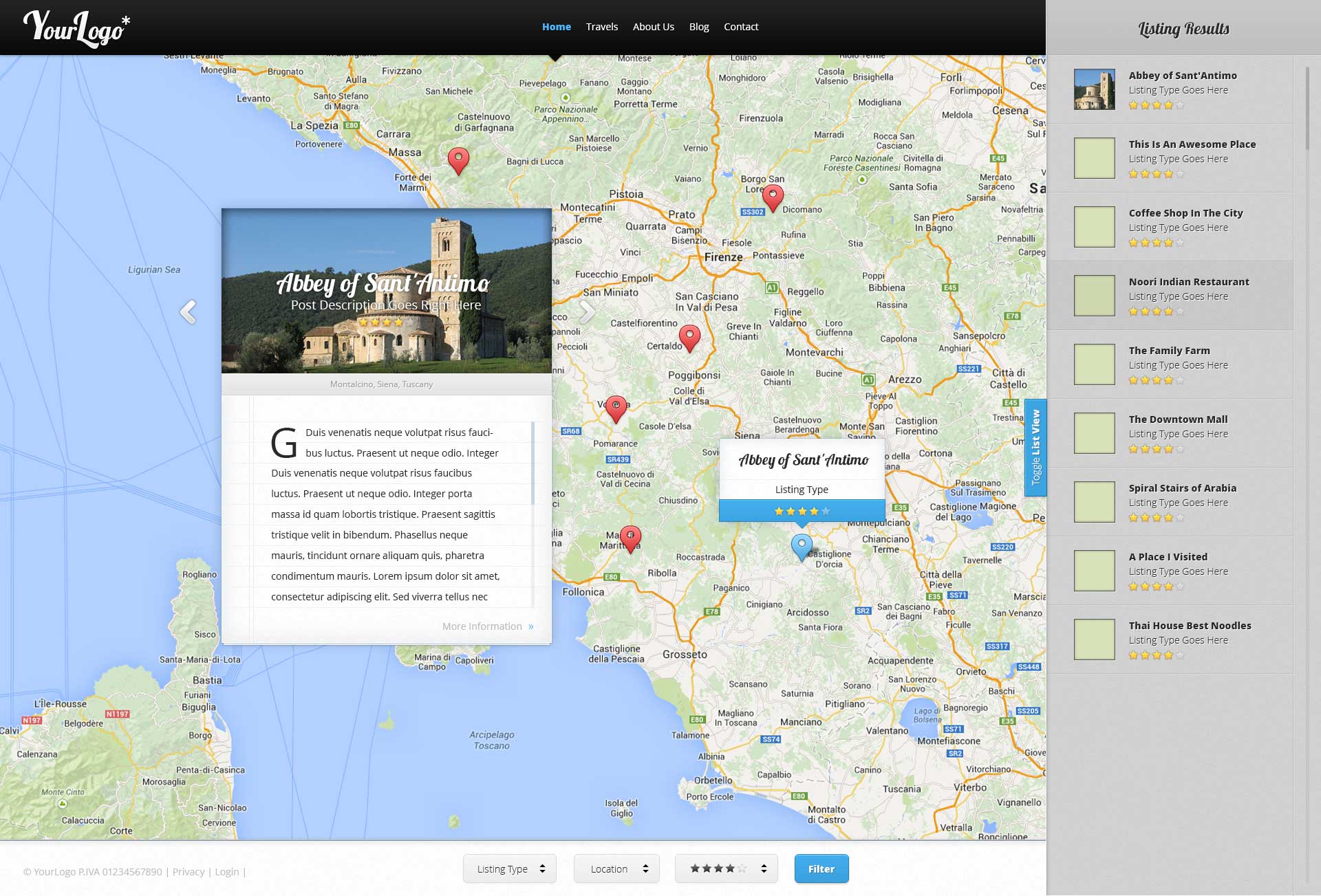 Andando al link qui in basso, potete apprezzare 4 screenshot di anteprima: la Home, in due versioni, senza e con la barra di destra, con l’elenco dei posti evidenziati sulla mappa, la pagina degli itinerarie e il blog. Potete passare dall’uno all’altro ciclicamente, facendo click sull’immagine stessa. Non è un vero e proprio sito navigabile. Sono solo immagini, con testo di esempio Lorem Ipsum, ma essendo in scala 1:1, si può apprezzare bene il forte l’impatto visivo, il carisma e l’originalità, che un layout del genere può conferire al vostro sito internet. Spero vi piacciano!