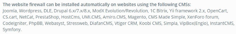Joomla, WordPress, DLE, Drupal 6.x / 7.x / 8.x, ModX Evolution / Revolution, 1C Bitrix, Yii framework 2.x, OpenCart, CS .cart, NetCat, PrestaShop, HostCms, UMI.CMS, Amiro.CMS, Magento, CMS Made Simple, forum XenForo, CodeIgniter, PhpBB, Webasyst, Stressweb, DiafanCMS, Vtiger CRM, Koobi CMS, Simpla, VipBox (Engio), InstantCMS , Symfony.