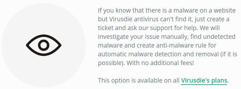 Se ritieni che ci siano ancora malware sul tuo sito web, ma l’antivirus automatico non riesce a trovarlo, puoi chiedere agli esperti di Virusdie di indagare manualmente sul problema. Creeranno nuove regole di rilevamento e pulizia, per te, senza costi aggiuntivi.