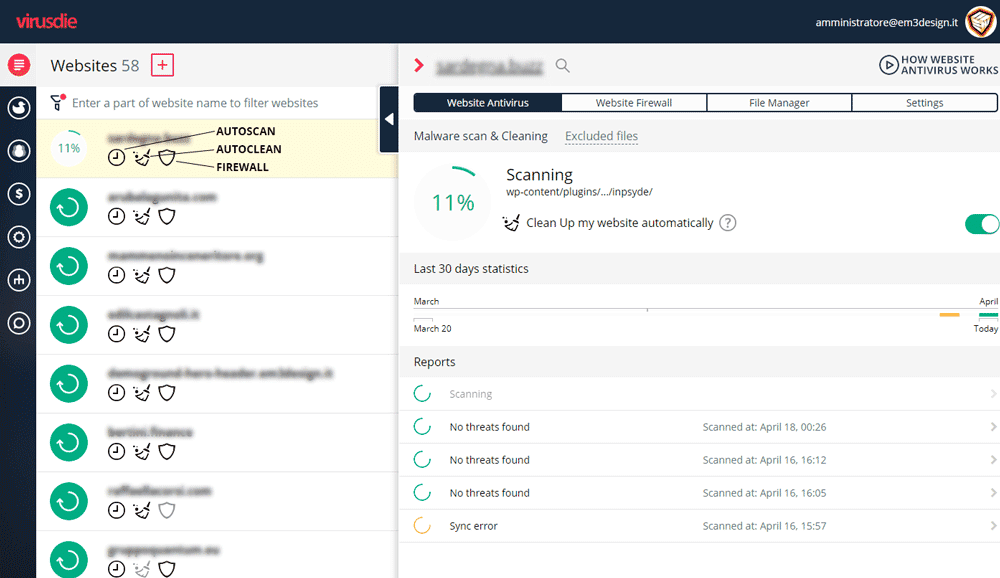 Virusdie è un servizio cloud che protegge completamente il tuo sito e il tuo server: sono integrati un antivirus, un firewall e un “riparatore” dei file compromessi. Il servizio non richiede l’installazione di software sul tuo computer host, server o account di web hosting; è sufficiente caricare un file .php nella root del sito, per avviare la connessione con i loro strumenti di protezione sul loro cloud server.